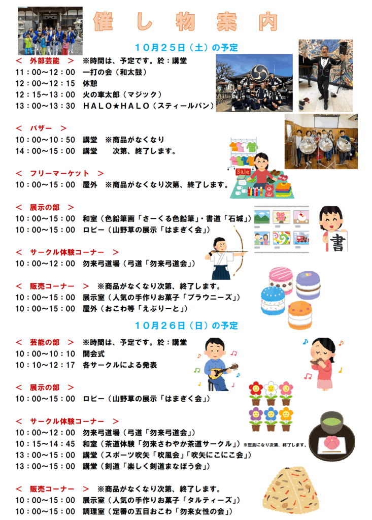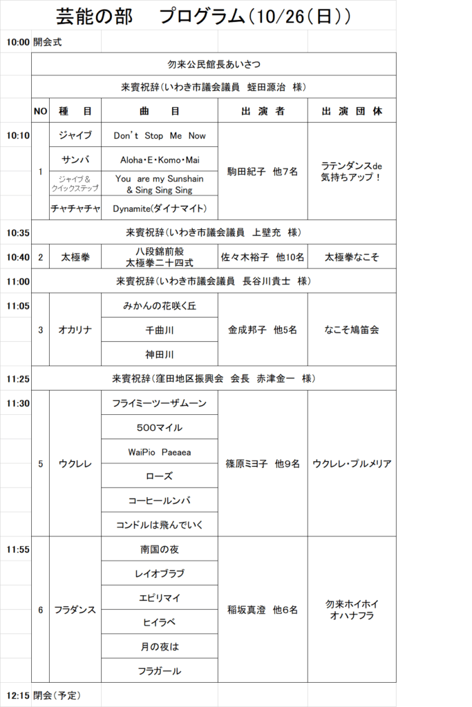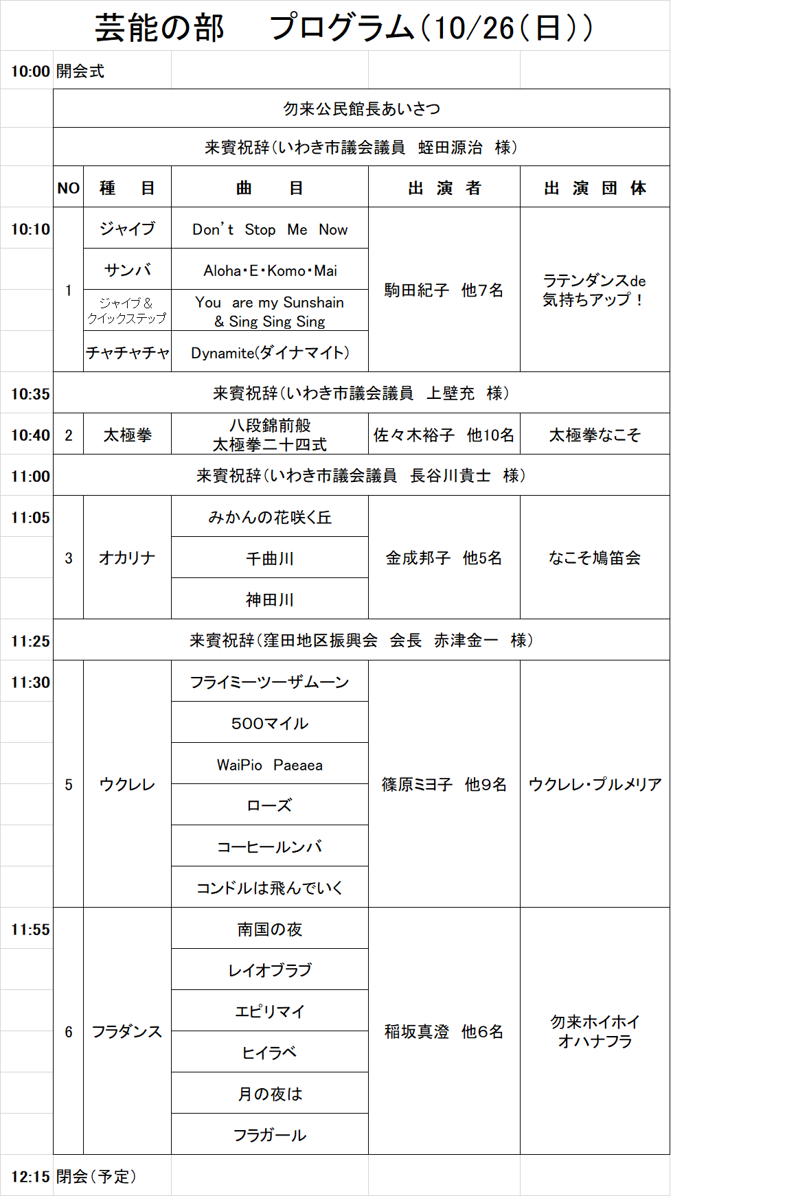芸能の部(10月26日(日))のプログラムは、こちらをご覧ください。