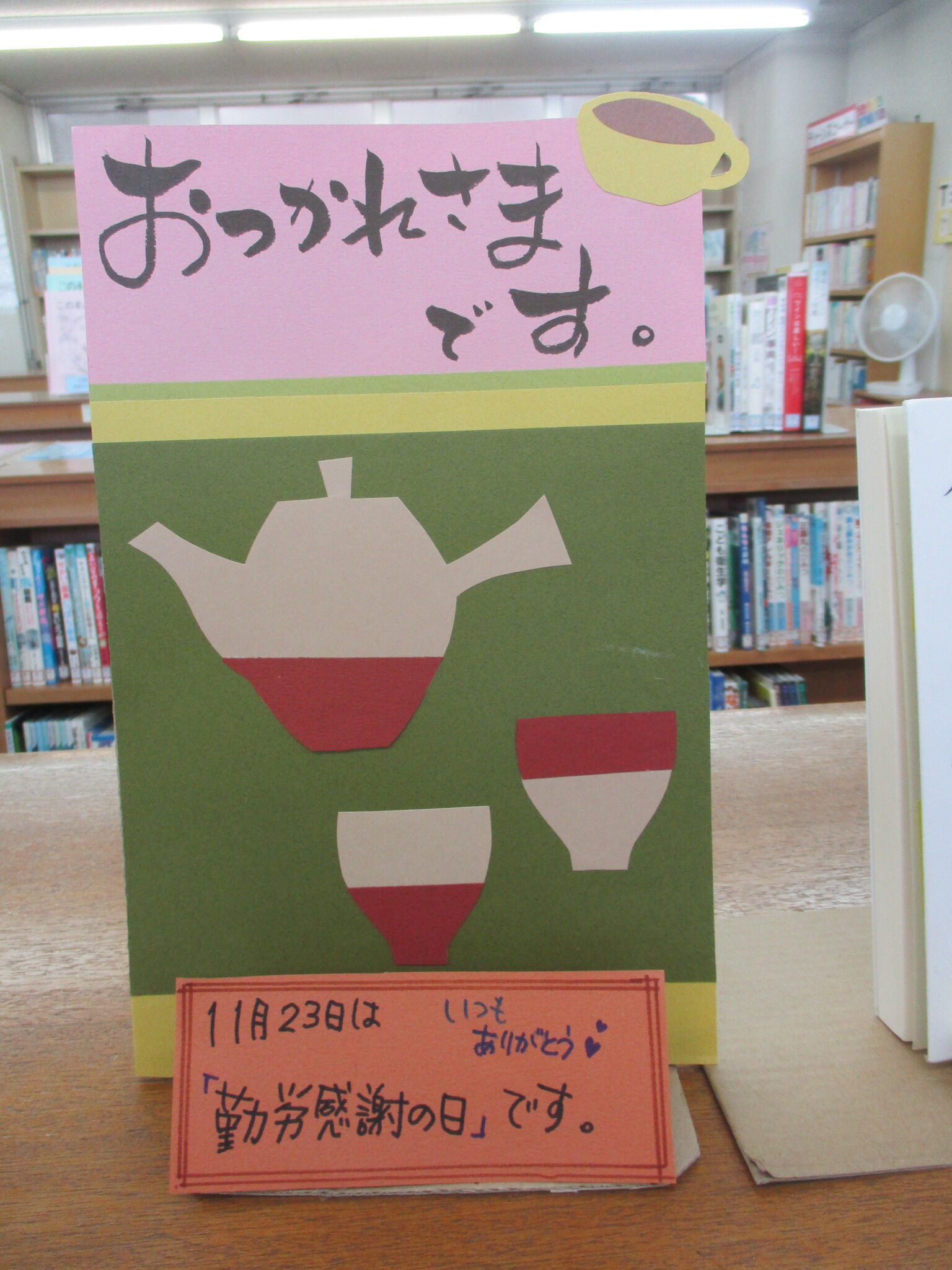 四倉図書館では、ミニ展示「11月23日は、勤労感謝の日おつかれさまです。」勤労感謝の日にちなみ、お仕事関連本を展示しました。是非、ご来館下さいますよう、ご案内いたします。