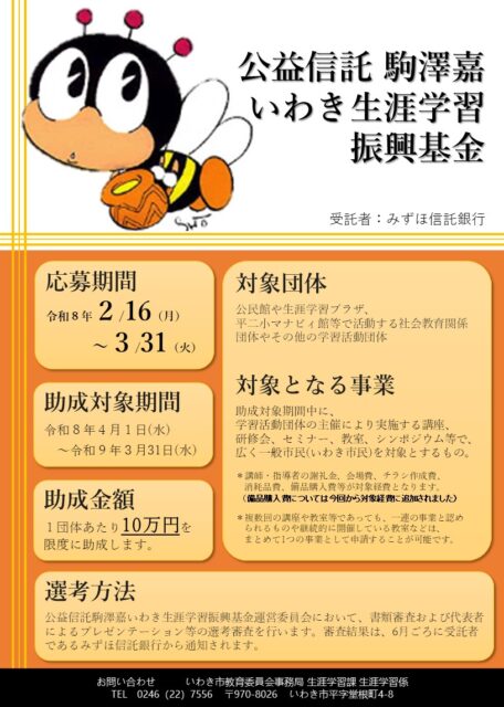 【生涯学習課】令和8年度「公益信託 駒澤嘉いわき生涯学習振興基金」助成団体募集中です