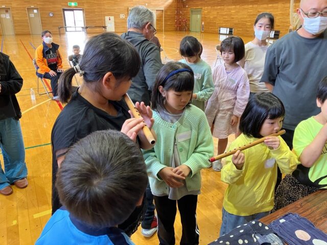 笛の実演です。みんなも音が出るかな?