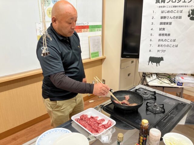 講師自ら調理します(シンプルに塩で食べて・・牛肉本来の旨味が口中に広がります)