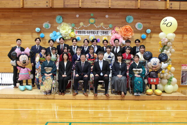 活動報告1月11日(日)、令和8年いわき市成人式が市内13地区で開催され、三和地区は「三和ふれあい館」において開催し、新成人21人が出席しました。振り袖やスーツ姿の若者たちは、友人との再会を喜び、記念撮影するなどしていました。
