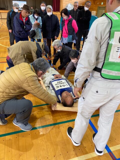 今回は、新たな試みとして「防災倉庫から災害の状況に合った必要な物資を選ぶ」、「身近にあるものを使用し怪我人を運ぶ」ことなどについて、住民が自ら考え実践するといった訓練を行いました。館長は班長として声掛けやアドバイスをしていましたが、夢中になり過ぎて「写真を撮る」ことをすっかり忘れてしまいました。次回の訓練では状況がうまく伝わるようたくさん写真を撮りたいと思います。