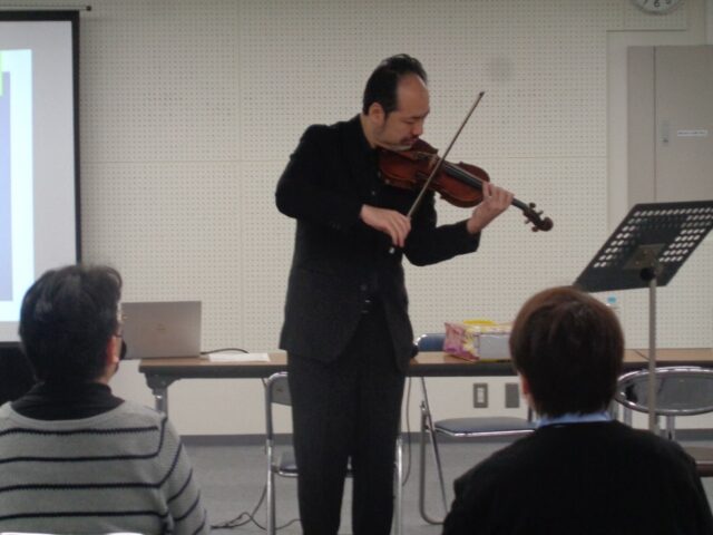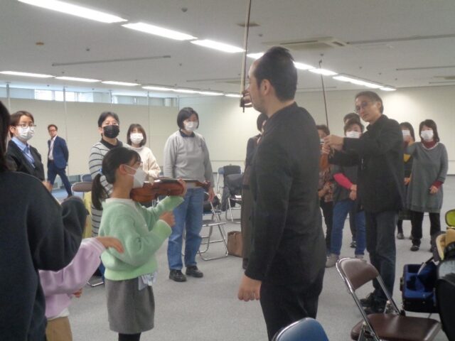 第1回は、NHK交響楽団ヴァイオリニスト三又治彦氏を講師に迎え、受講生の皆さんがヴァイオリンの演奏体験をしました。皆さん初めてではありましたが、音が鳴りとても喜んでいました。