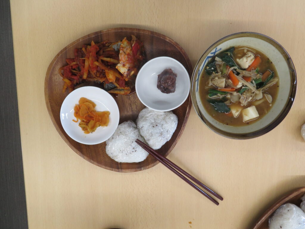 メニューは「じゅうねんおにぎり🍙、サバのトマト煮、じゅうねんのきのこみそ汁、こしあんまんじゅう」です。