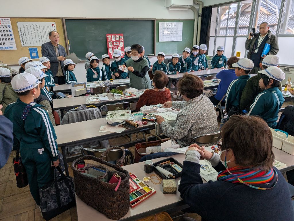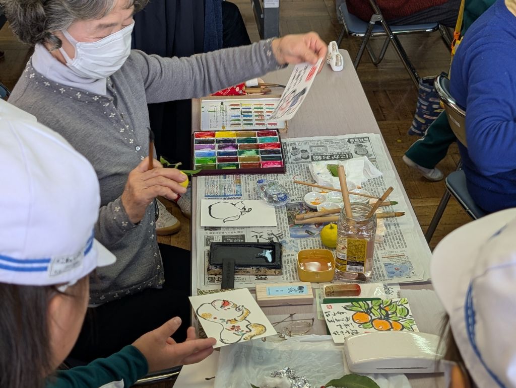 絵手紙サークルの見学では、年賀状の絵手紙の絵を描いているのをみることができ、手作りの年賀状で、絵をたいへん上手に描いている様子を見学し、小学生の皆さんも描いてみたくなったようです。
