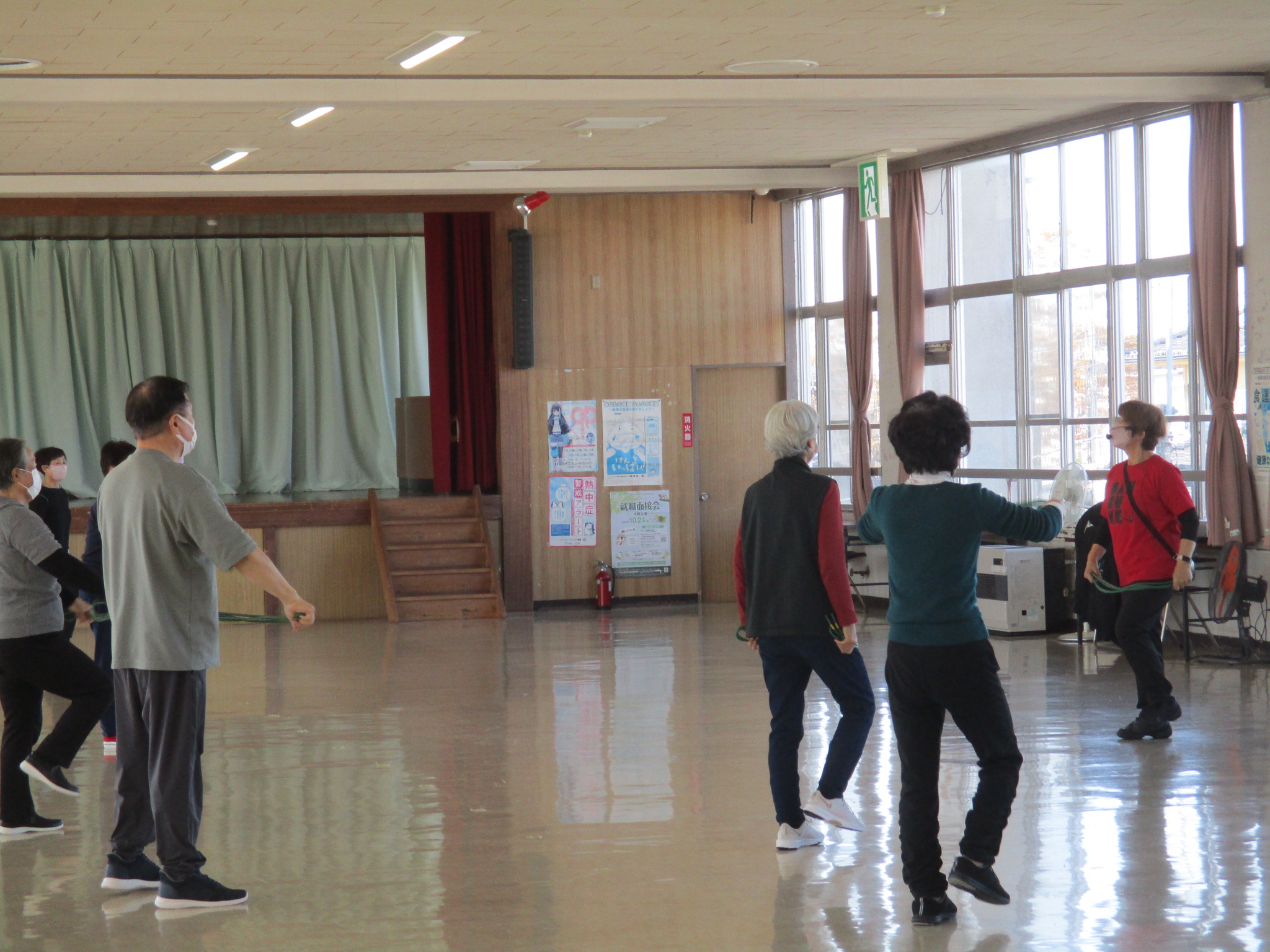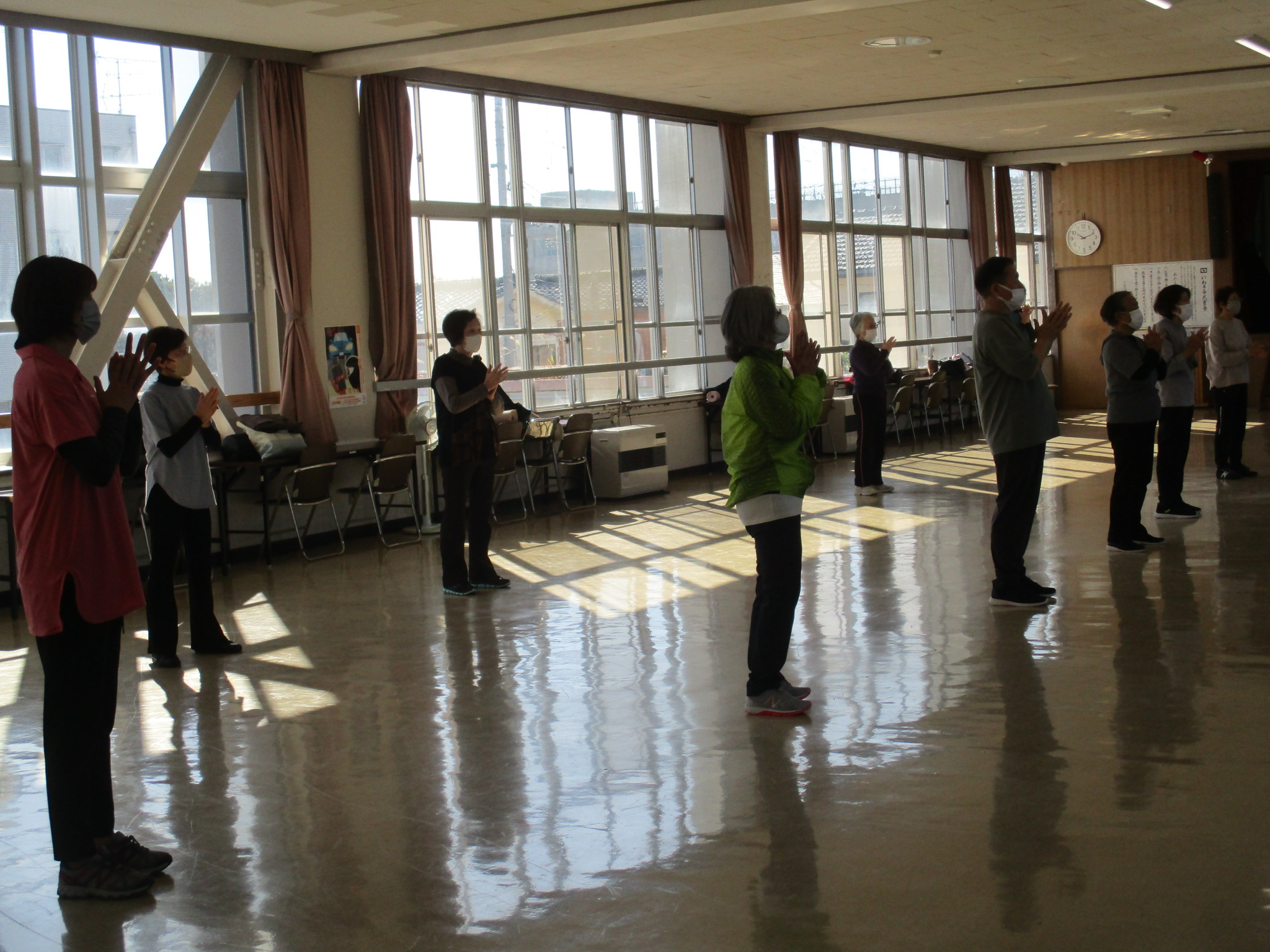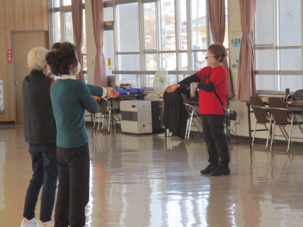 今日は、ゆる体操立位で身体を暖める体操や、骨盤体操、有酸素運動、筋力運動、などをおこないました。