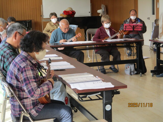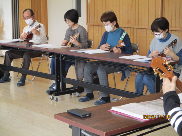 11月18日(火)にサークル体験講座「はじめてのウクレレ教室」の4回目が実施されました。今回が最終回で、参加者の皆さんも一つでも覚えたいと必死にウクレレ演奏に取り組んでいました。最後に成果として、みんなで「バラが咲いた」を演奏しました。また、田口先生や大浦ウクレレ教室の皆さんの丁寧な指導もあり、約5名がサークルに加入することになりました。皆さんに感謝したいと思います。