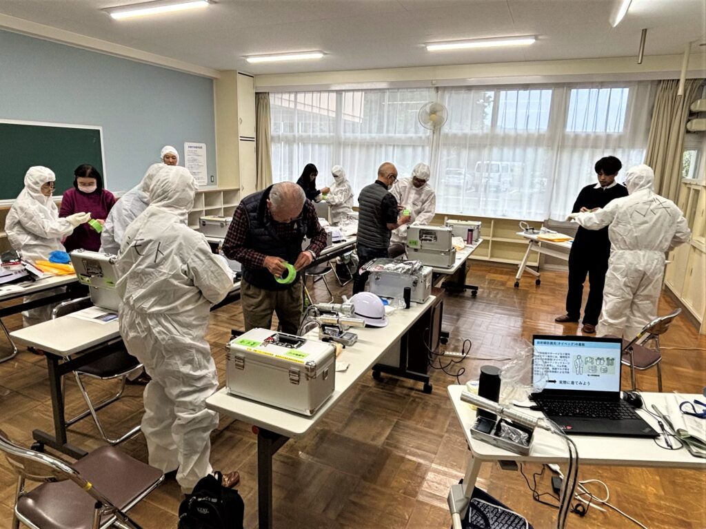敷地内の他、近くにある山林の一部も測定しましたが、極端に高い場所はありませんでした。公民館に戻り、最後は災害時等で活躍する持ち運び可能な放射線測定装置について説明を受けます。