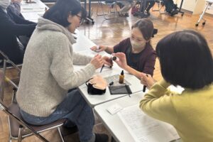 「素敵な空間に癒されまくりです」「先生のプロのハンドケアを受けられて貴重な体験でした」「教えてもらった方法を母親にしてあげます」アロマで至福の一時を過ごした受講生は、穏やかな笑顔で満ちていました。