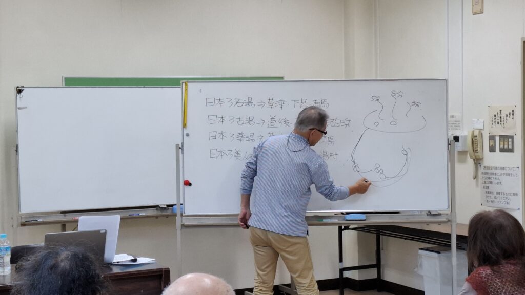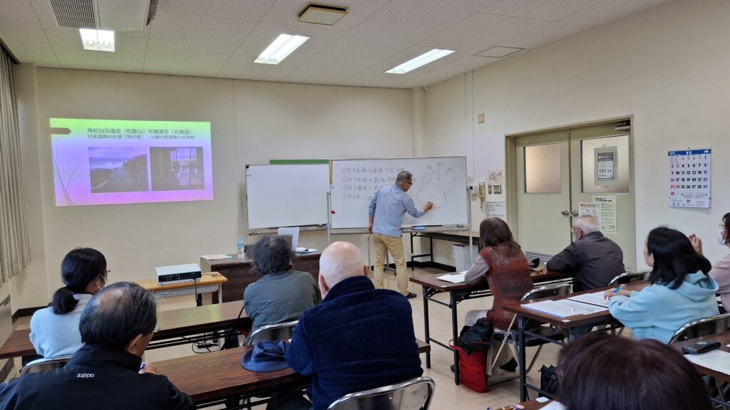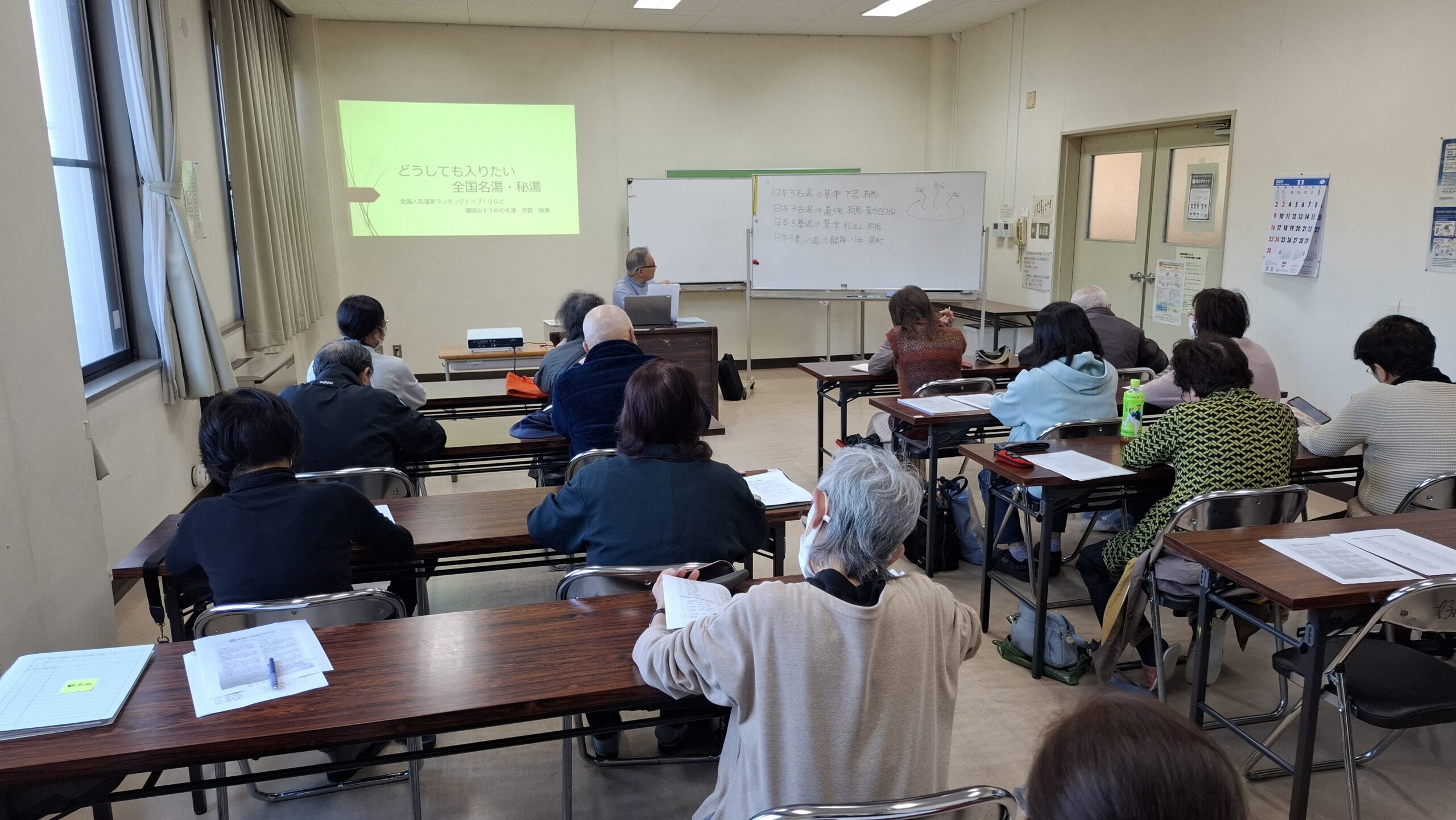 活動報告11月14日(金)、「絶対行きたいお勧め日本の観光地」の3回目の講座が行われました。今回も講師の秀明大学の市川友英さんから「全国温泉ランキングトップ100(観光経済新聞社2024年度)」に関わる温泉地の紹介とそこへ行った時の感想などの講義をしていただきました。
