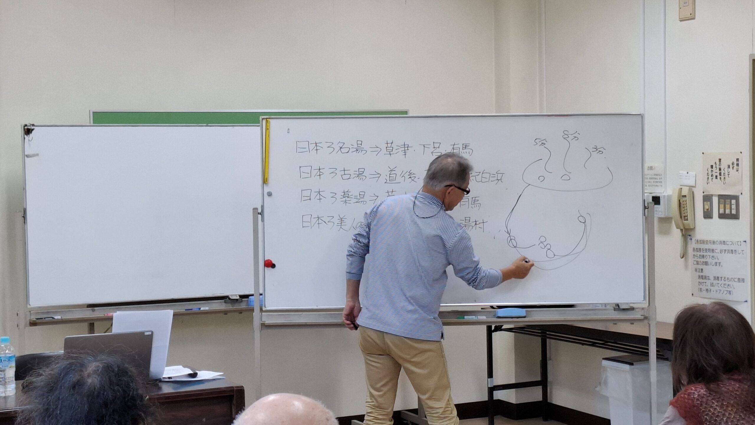 これまで20年以上も人気No1を誇っている群馬県の草津温泉、坊ちゃんで有名な愛媛県の道後温泉など、人気上位53位までの様々な人気の由縁などが語りつくされました。54位からは次の講座で紹介されると思いますが、ぜひ行って見てそこの旅館で温泉に入浴してみたいと思えてくる魅力あふれる講座でした。受講生は、自分も体験したことがあると言った感じでうなずいていました。