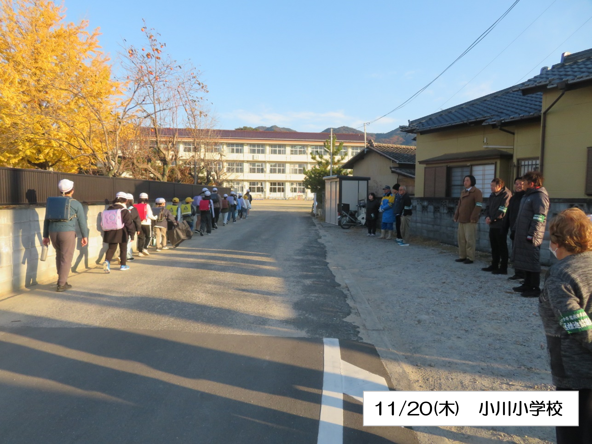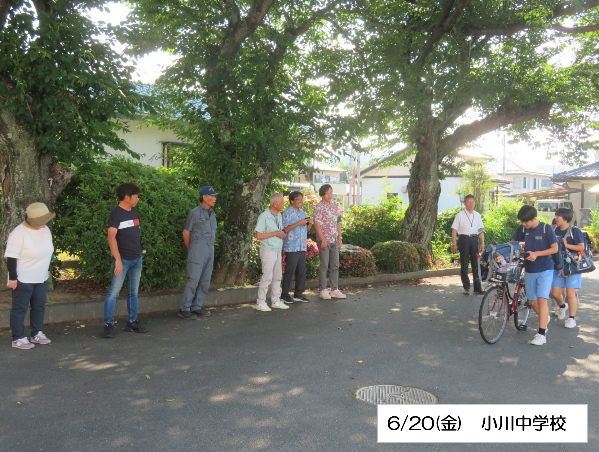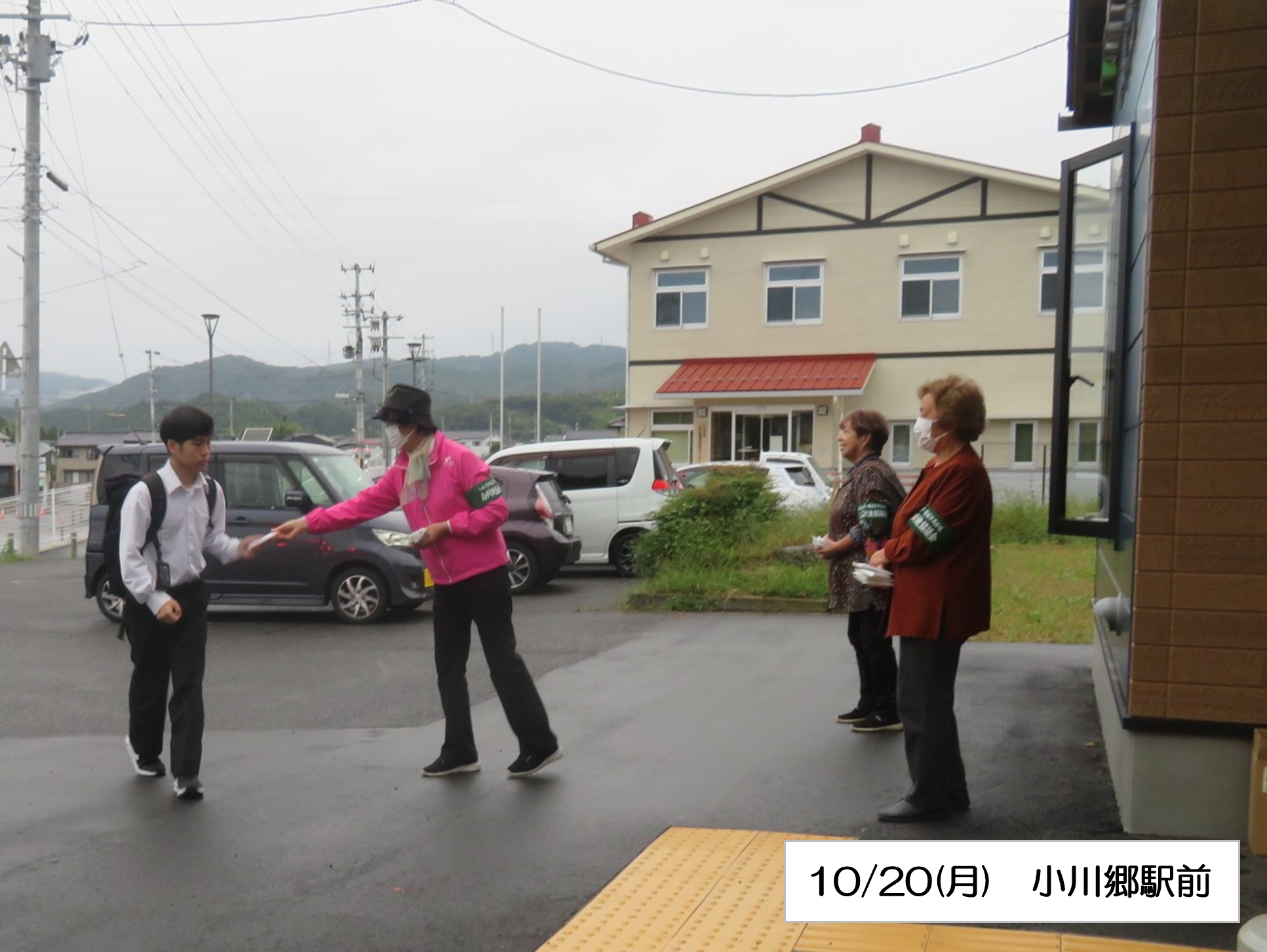 青少年育成市民会議小川地区推進協議会では、地域の子どもたちに明るく健やかに登校してもらうことを目的に、学校休日を除く毎月20日に、「小川郷駅」「小川小」「小玉小」「小川中」の4か所で、順番に場所を変えながら「朝のあいさつ運動」を実施しています。