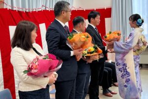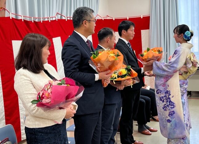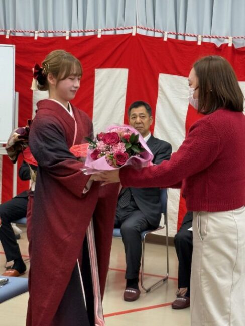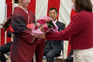 最後に新成人から恩師と保護者へ、感謝の言葉を添えながら花束を贈呈しました。