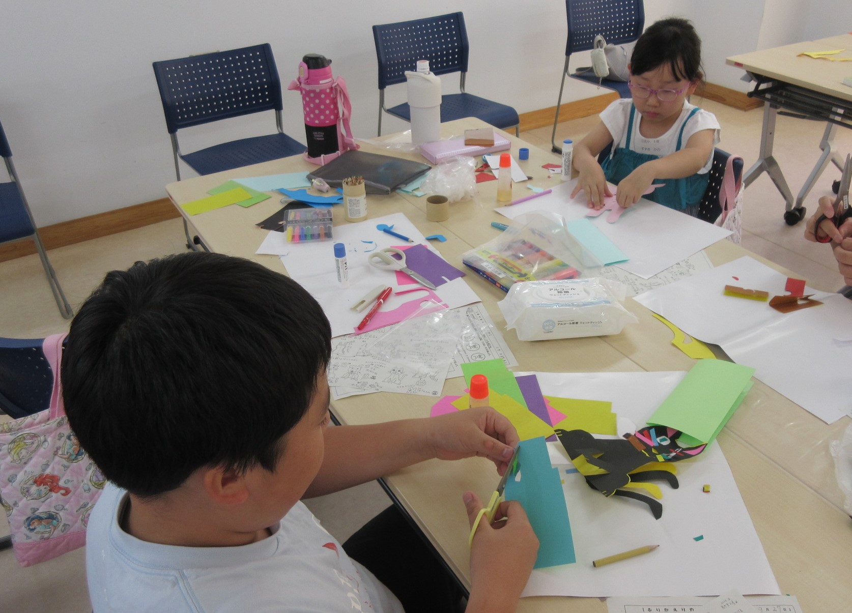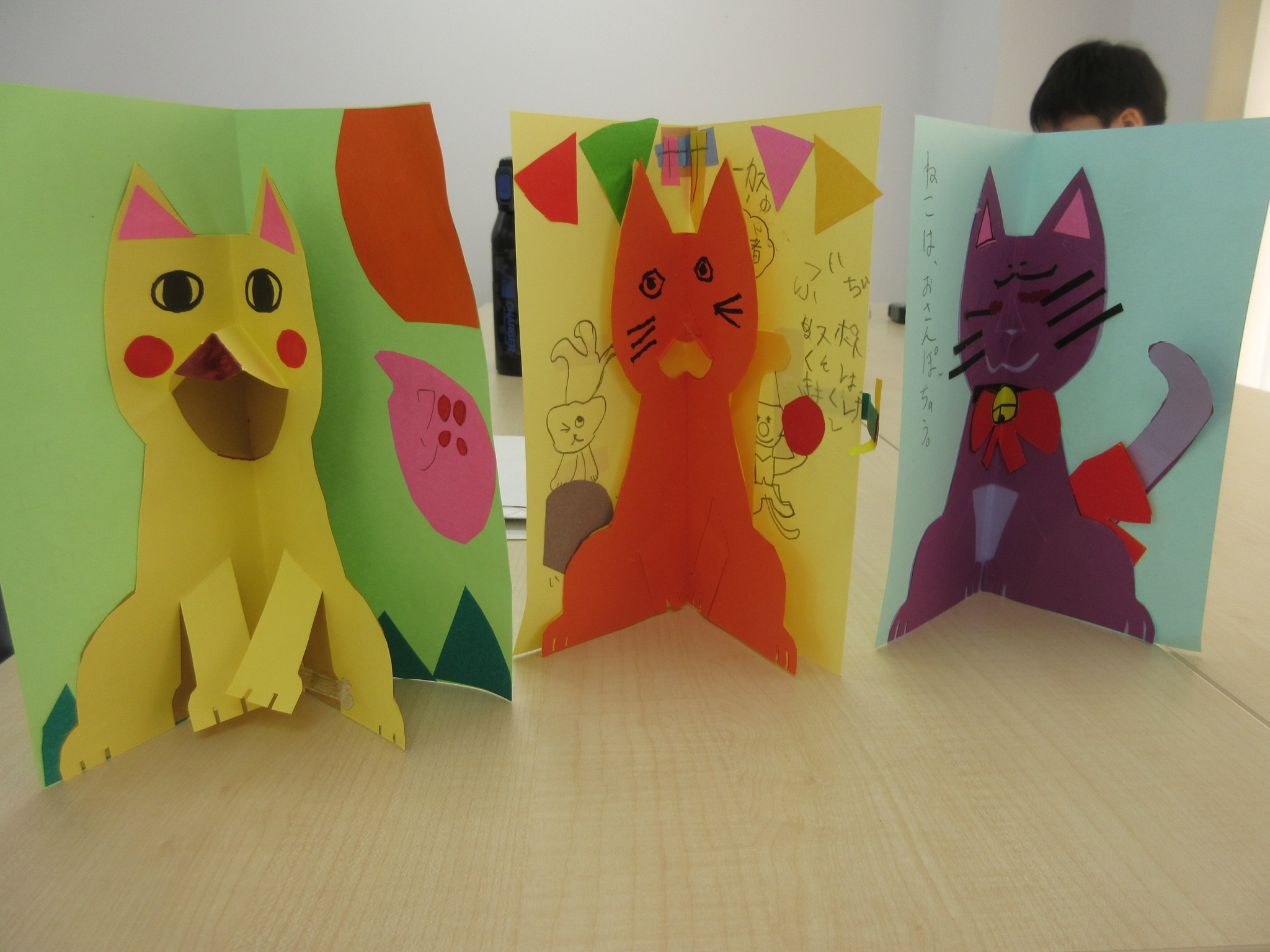 今回は、うさぎ・ねこ・いぬのスタンド絵本を作成しました。それぞれ好きな型を選び、開くと動く工夫を取り入れて楽しく装飾しました。子どもたちの豊かな発想で、カラフルな楽しい作品ができました。紙でいろいろなことができるすごさと楽しさを感じることができました。