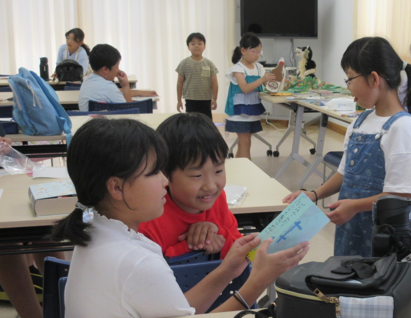 江名小学校、永崎小学校の1~6年生13人の参加で、絵本作家の佐藤先生がお持ち下さったたくさんの作品を見せていただき、しかけ絵本の世界を楽しみました。