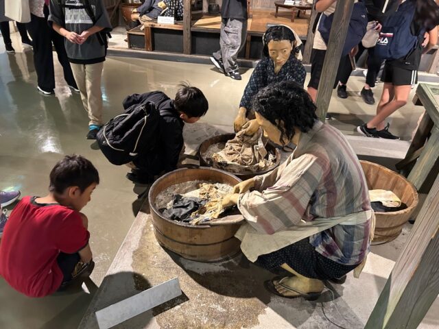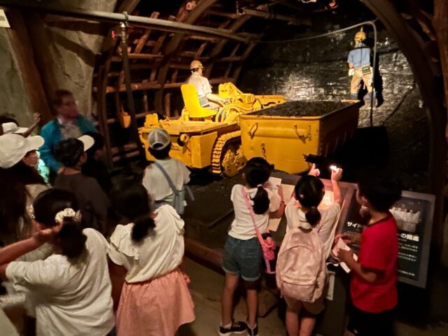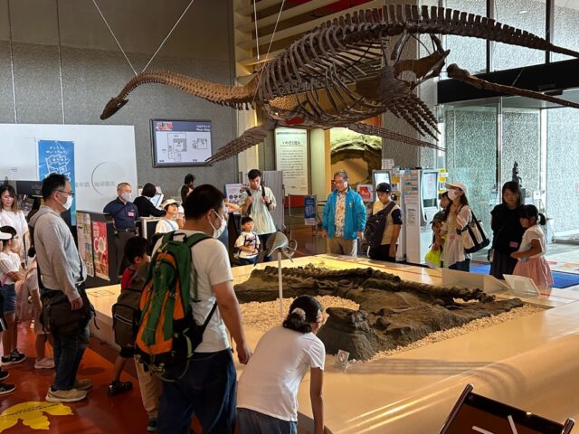 「いわき市石炭・化石館 ほるる」を会場に、江名小学校、永崎小学校の1~6年生14人の参加で、渡辺学芸員の説明を聞きながら見学しました。いわき市で発見された「フタバサウルス・スズキイ」の模型や巨大な恐竜、大型爬虫類等が展示されおり、子どもたちはダイナミックな空間で太古の世界を楽しみました。竪坑を模したエレベーターで地下に下る体験をしたり、炭鉱で働いていた当時の仕事の様子や暮らしについて学び、大変さなどを学びました。
