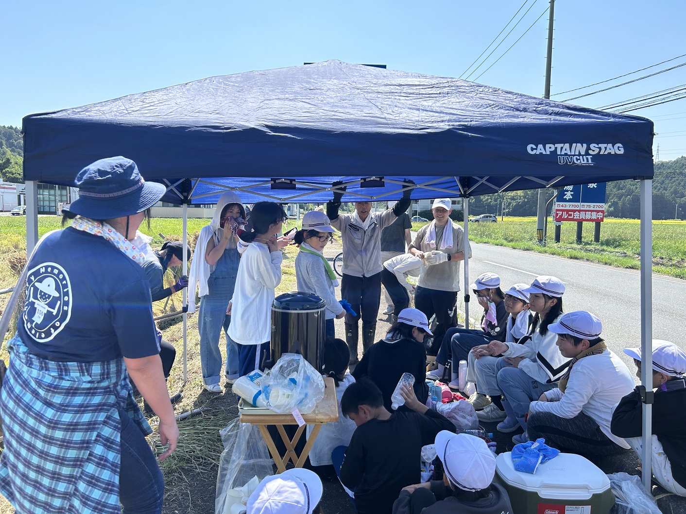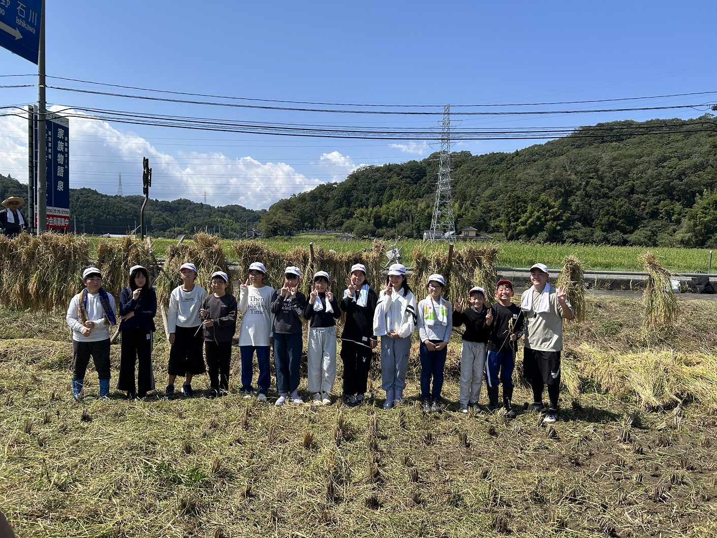5年生と保護者の方々、そして応援団のみんなで頑張ったおかげで稲刈りが終わりました。