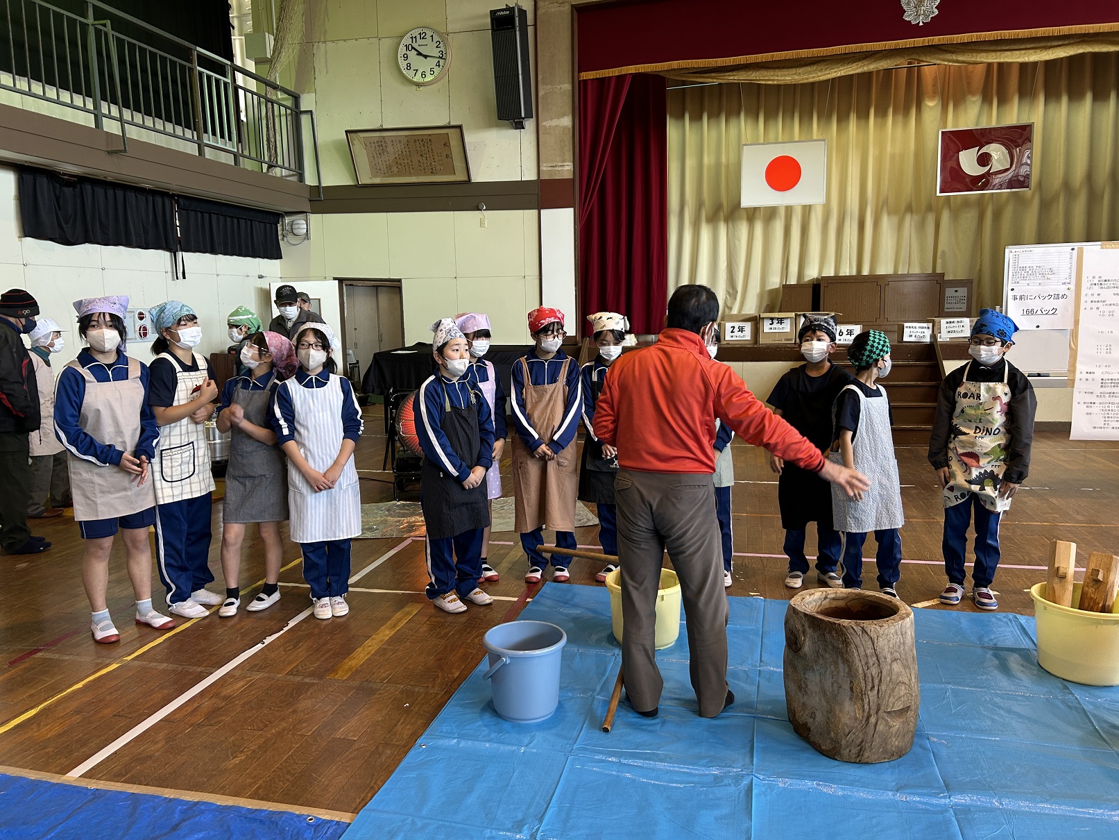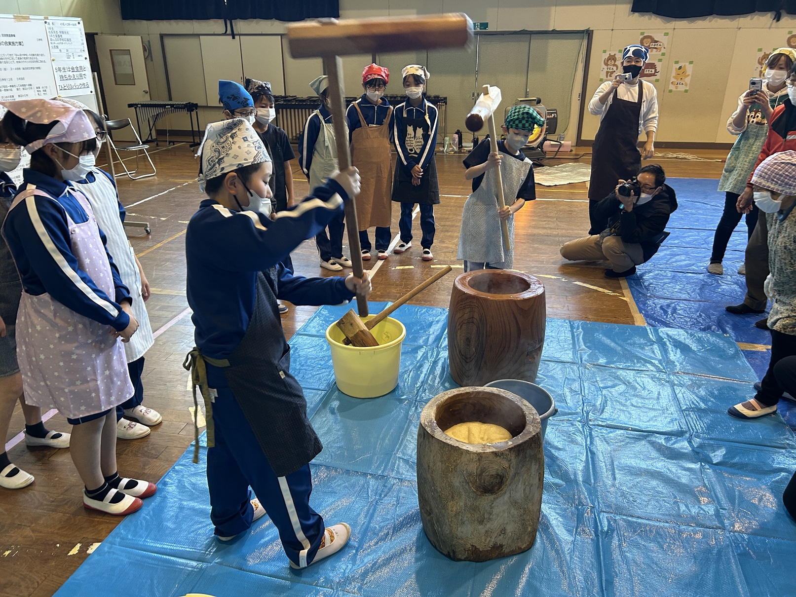収穫祭は、5年生12名が田植え・稲刈り・脱穀したもち米で餅つきを行い、お雑煮やあんこ餅・きなこ餅を作って食べ、また、他の学年の児童全員にもパック餅にして配る、という特別なイベントとなります。