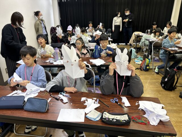 A4サイズの紙で、先生の言うとおりに折ったりハサミで切っていくと、ウサギが出来上がってみんな喜んでいます。