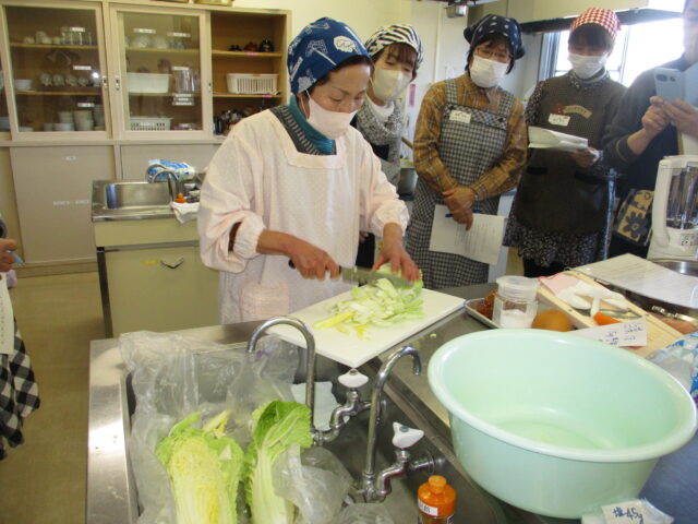 活動報告1月24日(土)新妻先生を講師に迎え白菜キムチづくりを行いました。多数の応募者の中から抽選で選ばれた12名が参加しました。応募のきっかけは「自分で作った白菜でキムチを作りたい」「キムチが大好きなので自分でも作ってみたい」「白菜をたくさんいただいたのでキムチにしてみたい。」でした。