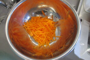 人参の千切りと唐辛子等キムチの具となるものをよく混ぜます。