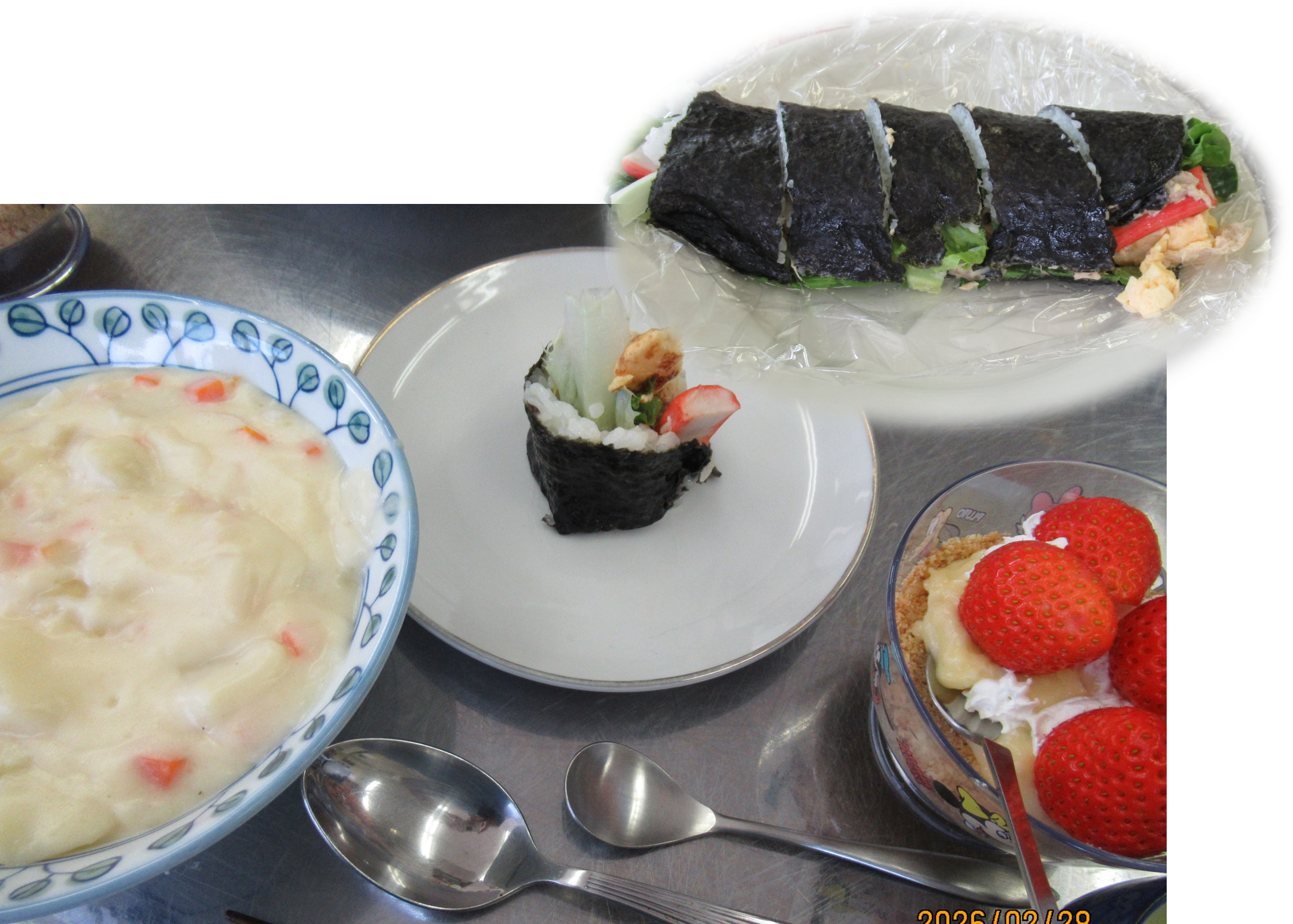 鶏肉のクラムチャウダー・いちごのタルト・シーチキン太巻き