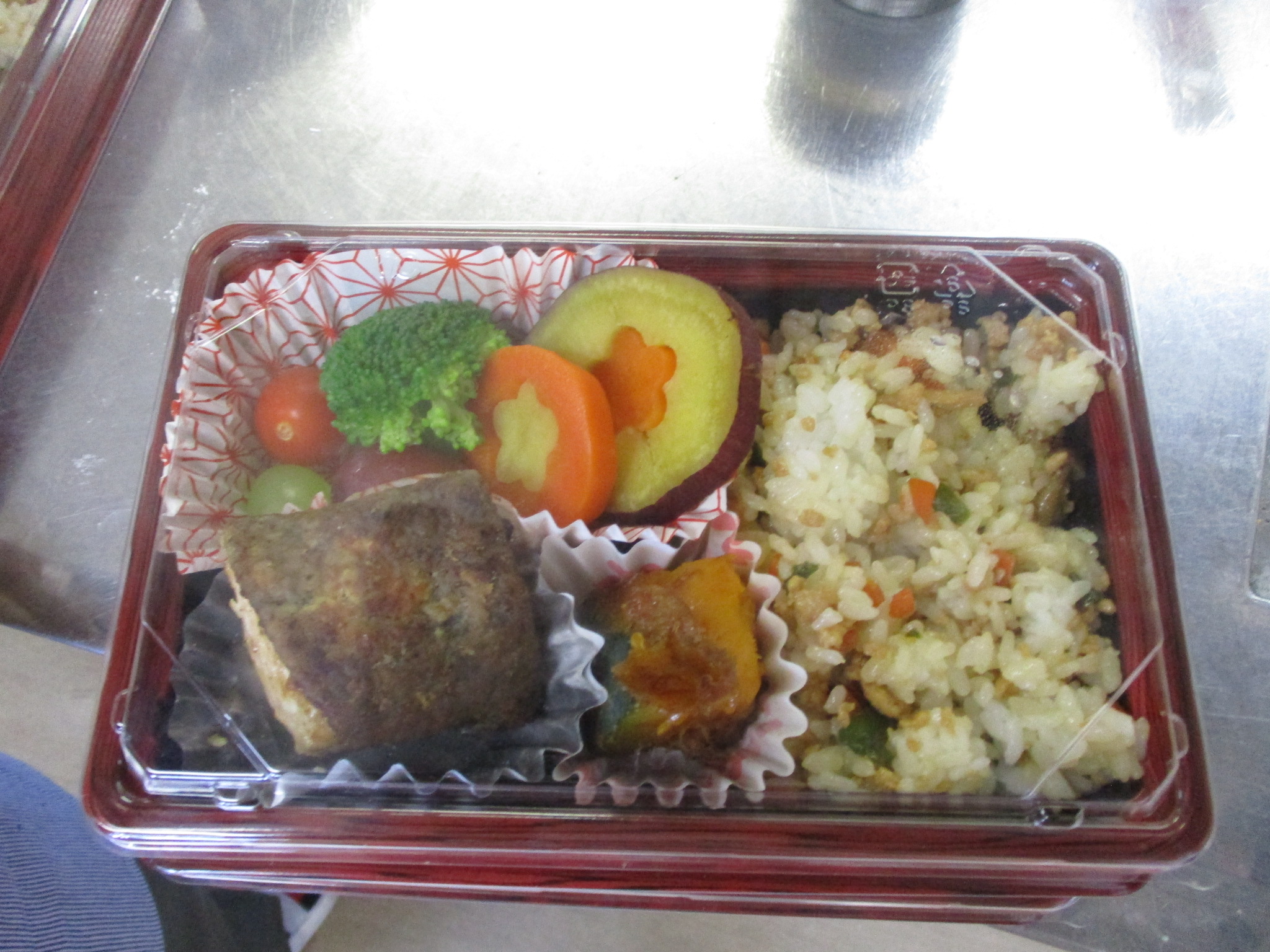 今回作るのは、鶏ひき肉のまぜご飯・秋鮭のバター焼き・おかかかぼちゃ・さつまいもとにんじんの甘煮の4品に加えて、ブロッコリーとトマト、ぶどうを添えたお弁当です。