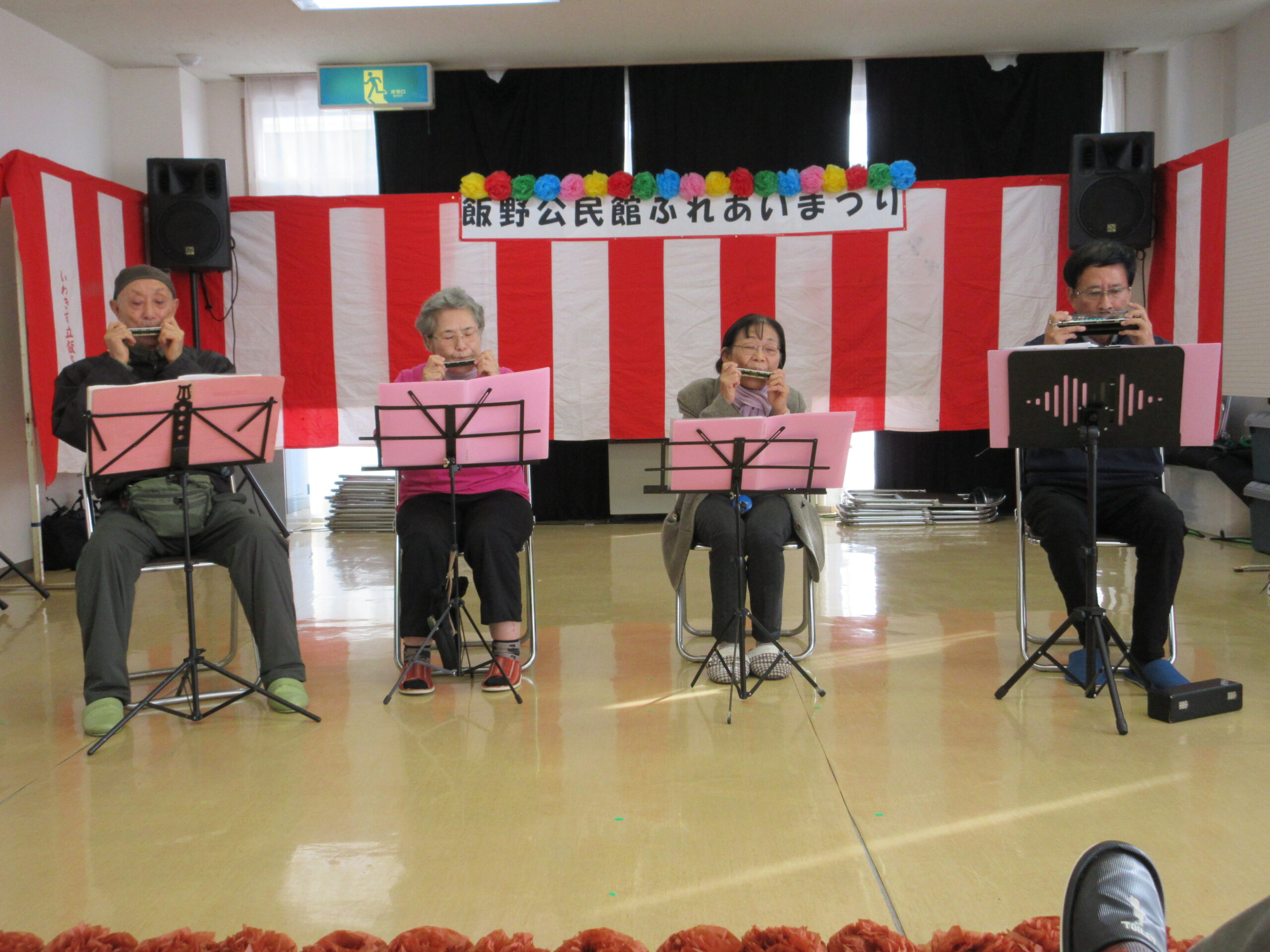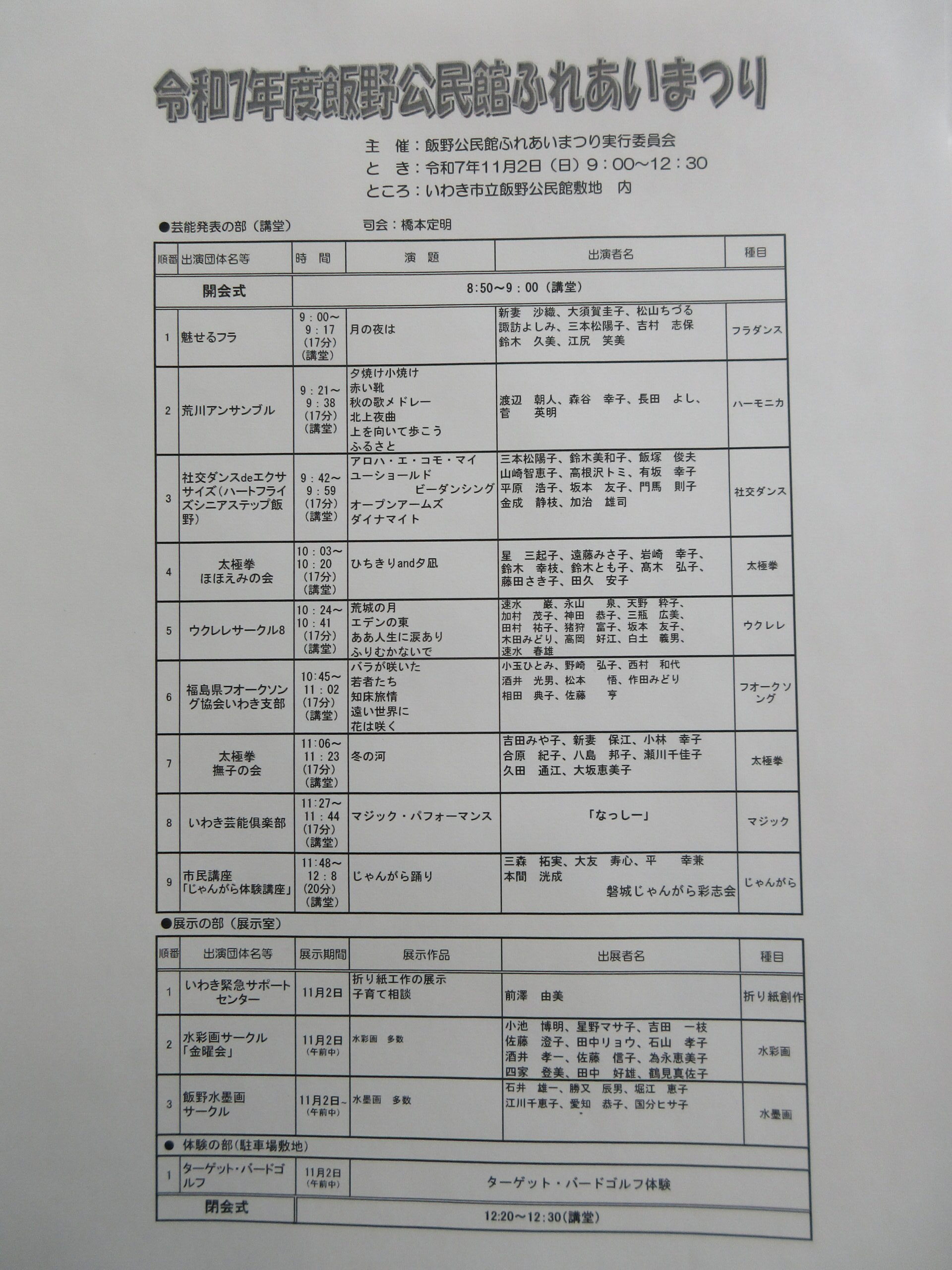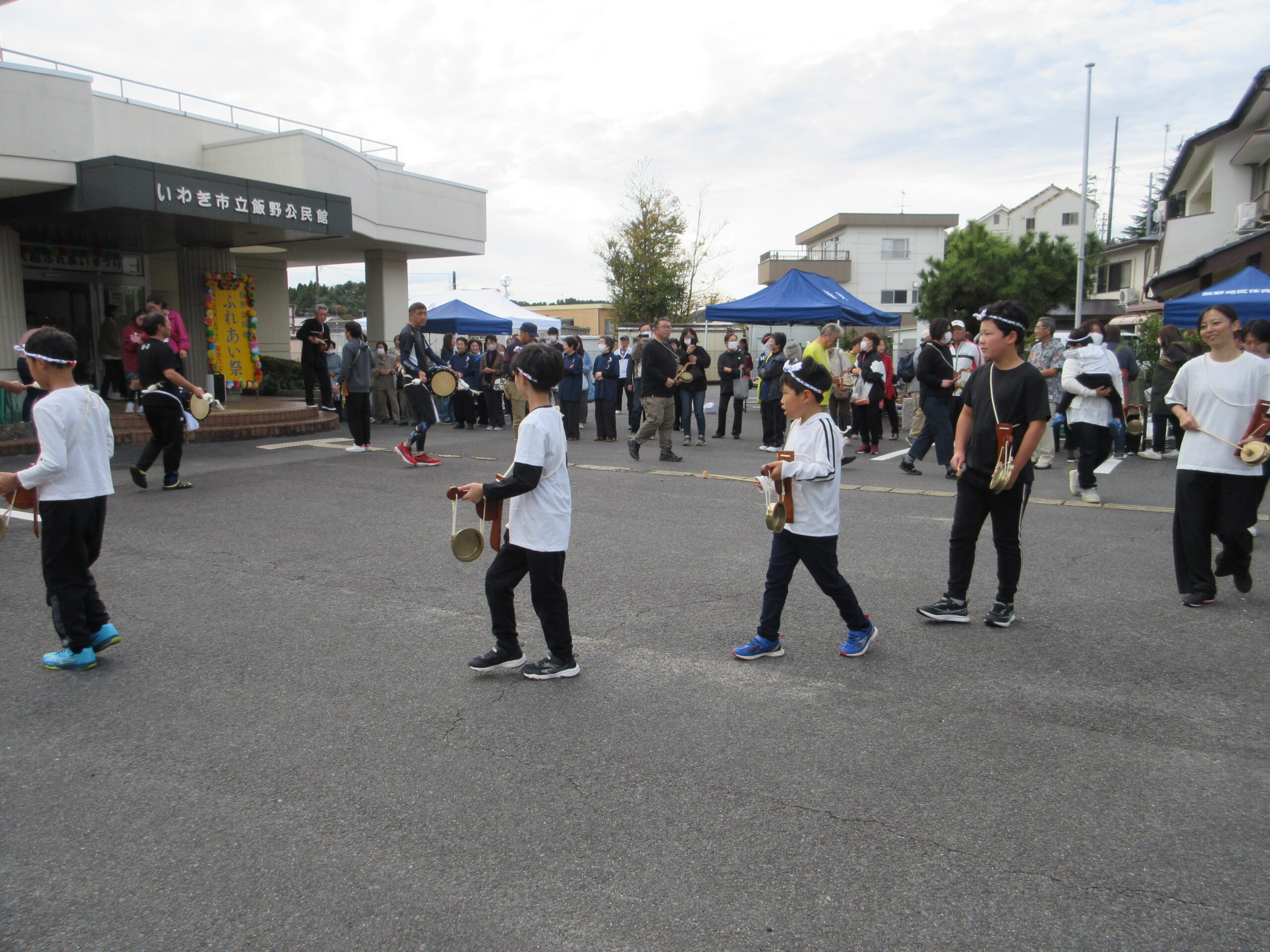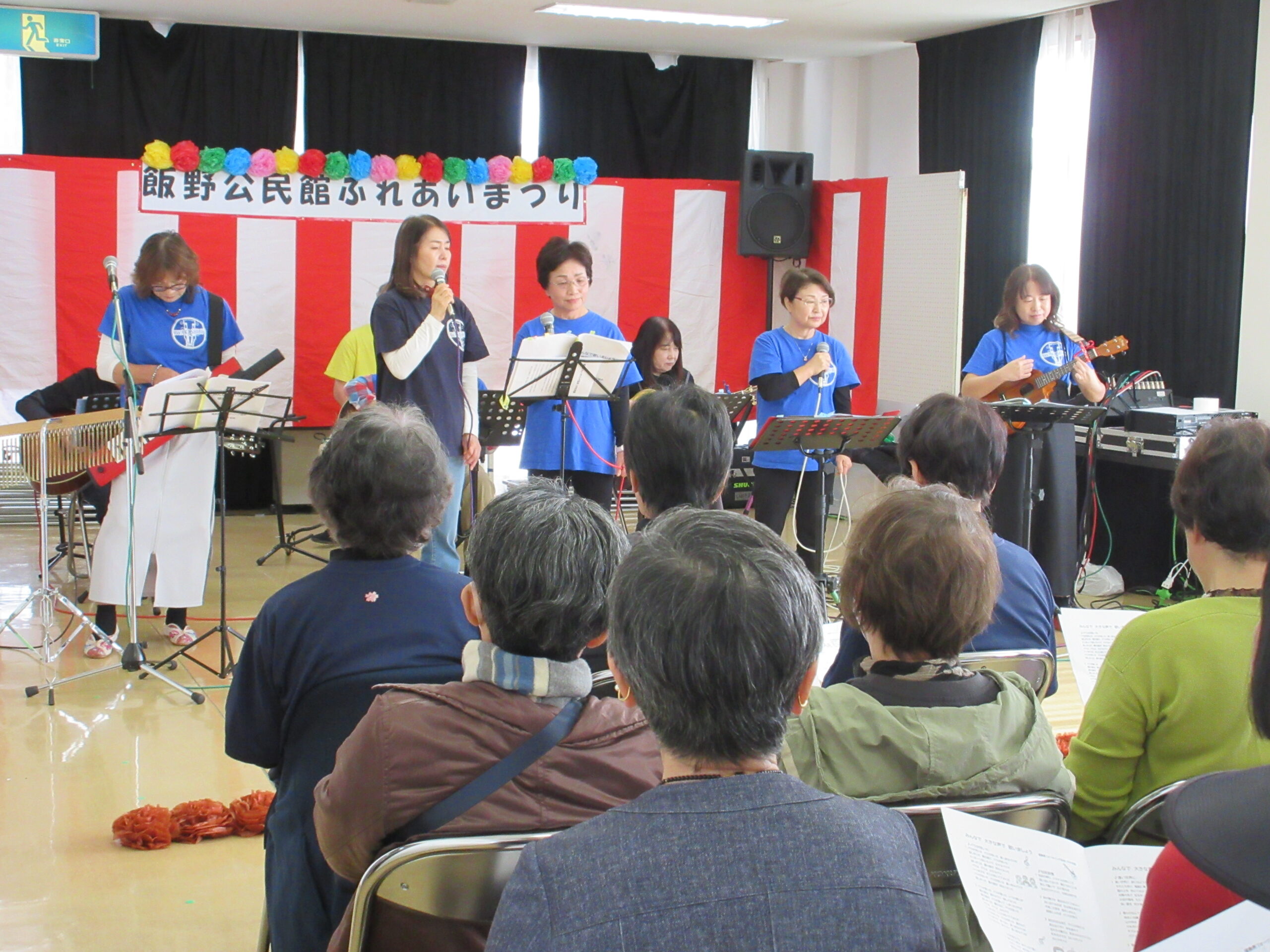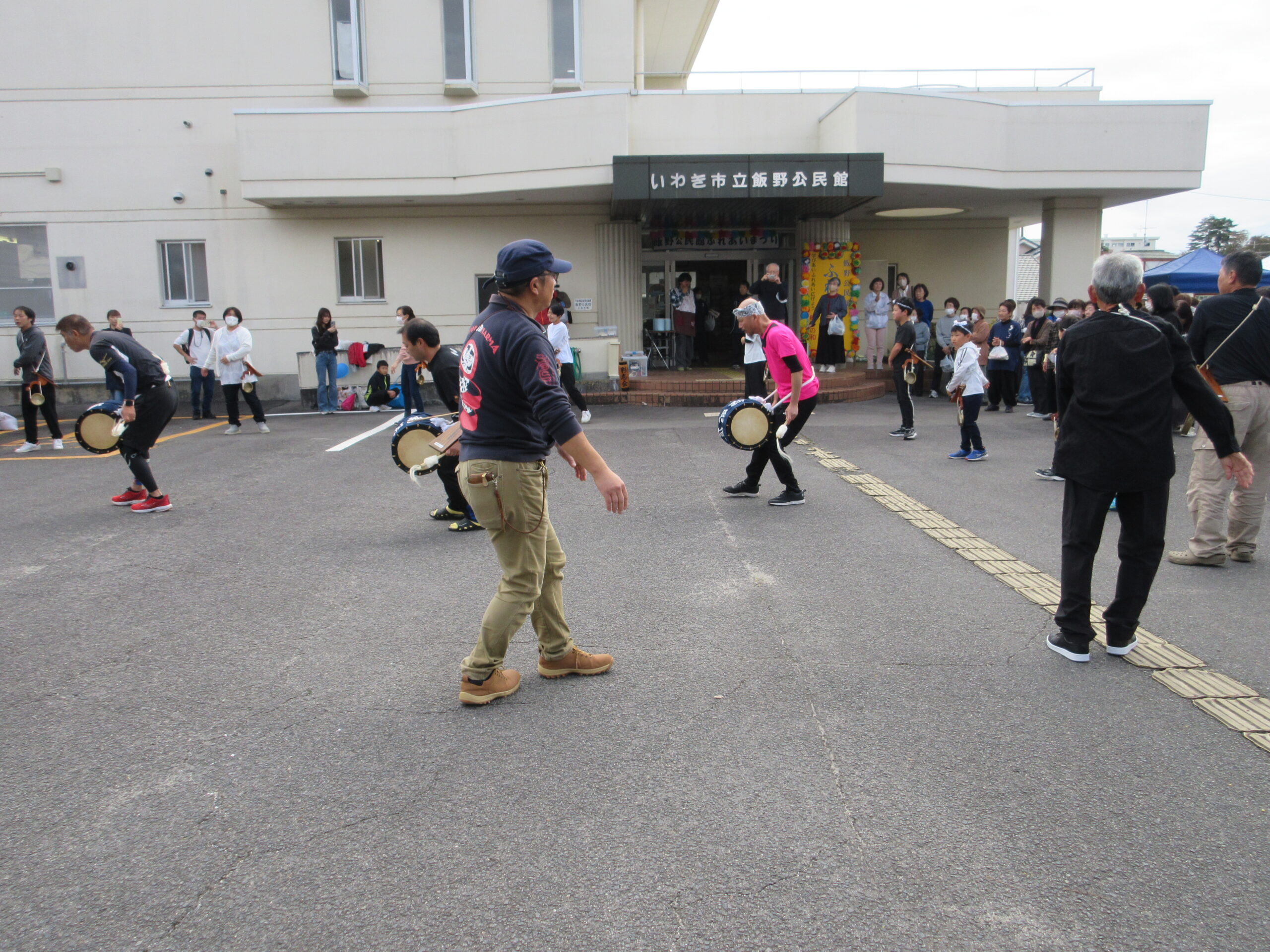 🌸11月2日の日曜日は秋晴れの快晴のもと「飯野公民館ふれあいまつり」が賑やかに開催されました。芸能発表が9団体のほか、展示の部・健康相談コーナーやバードゴルフ体験、バザーコーナーなど多種多様に参加が得られました。特に「市民講座」からは「じゃんがら体験講座」が参加し、屋内発表を予定しておりましたが、急遽発表場所を屋外に変更したところ、鐘の音を聞きつけた住民が多数集まり拍手喝さいを送って楽しい「まつり」となりました。🌸